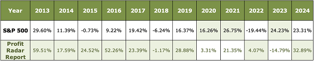 The table below compares the S&P 500 performance against the net gain of Profit Radar Report trades: