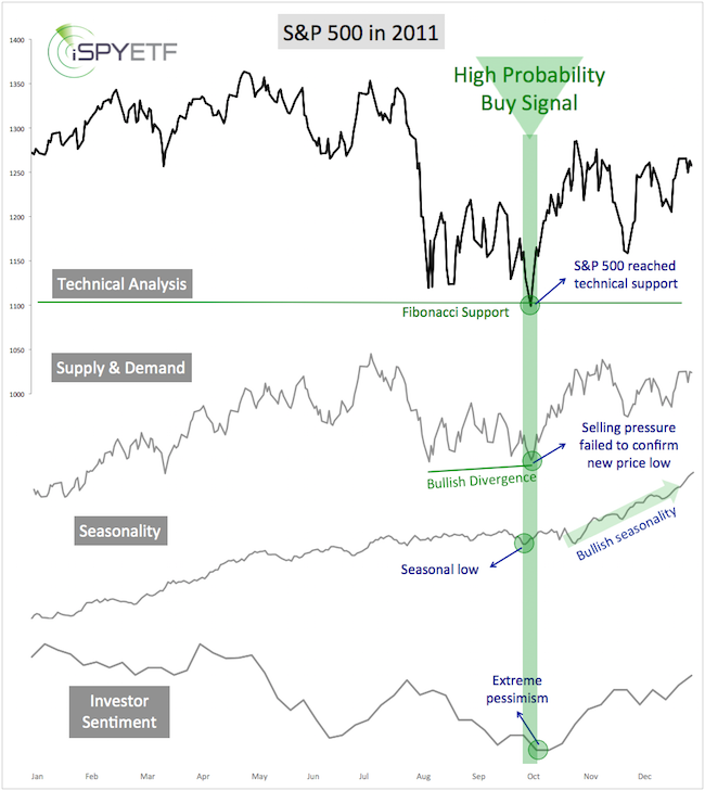 The chart below visually illustrates the October 2011 buy signal at S&P 1,088 on October 4, 2011. Technical analysis, supply & demand, seasonality and investor sentiment all converged for a strong high probability buy signal.